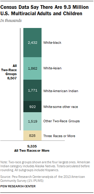 I love this chart because it can open people’s eyes and make them aware that multiracial people are not just a mix of White and Black. My own mother said she didn’t think of a person being Asian and White as being multiracial and I don’t think she is alone. One of the largest populations of multiracial people on the rise is Native-American and White, I was surprised by that statistic. We can see that the multiracial melting pot has a lot more ingredients then people realize. According to this chart there are at least 1,519,000 other two race groups. It’s not just white and another race. Being Black and Asian for example is multiracial. We are so many and so diverse. I want to see faces and hear stories to make the charts and statistics come alive!